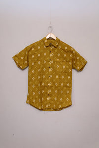 Olive Minimal Ikat Unisex Cotton Shirt features subtle ikat-inspired patterns in soothing olive hues that exude understated elegance. Made from breathable cotton, it offers a relaxed and versatile fit, ideal for casual outings, cultural gatherings, or everyday comfort.